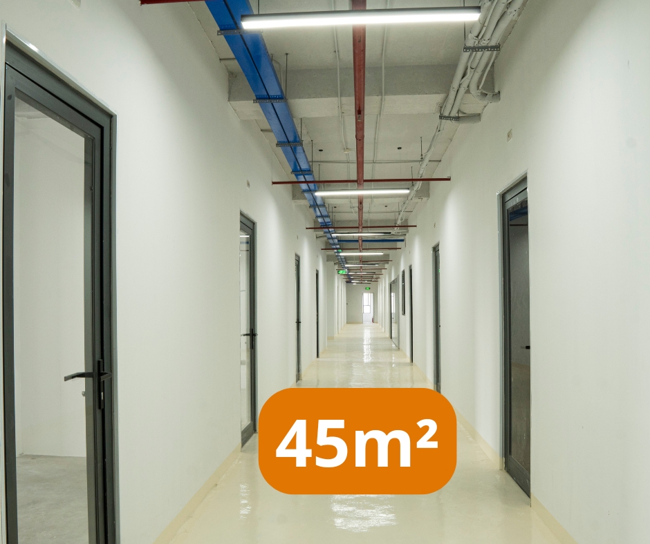 Với diện tích 45m², doanh nghiệp có thể dễ dàng bố trí không gian làm việc khoa học mà vẫn tiết kiệm ngân sách.
